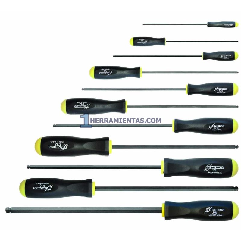 JUEGO DE 11 DESARMADORES HEXAGONALES PUNTA DE BOLA FRACCIONALES. 5/64″ A 3/8″ EXTRA LARGOS. BONDHUS 10737