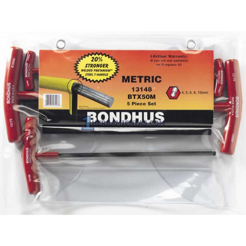 JUEGO DE 5 LLAVES HEXAGONALES MÉTRICAS CON MANGO EN “T” PUNTA DE BOLA. 4.0 A 10.0MM. BONDHUS 13148
