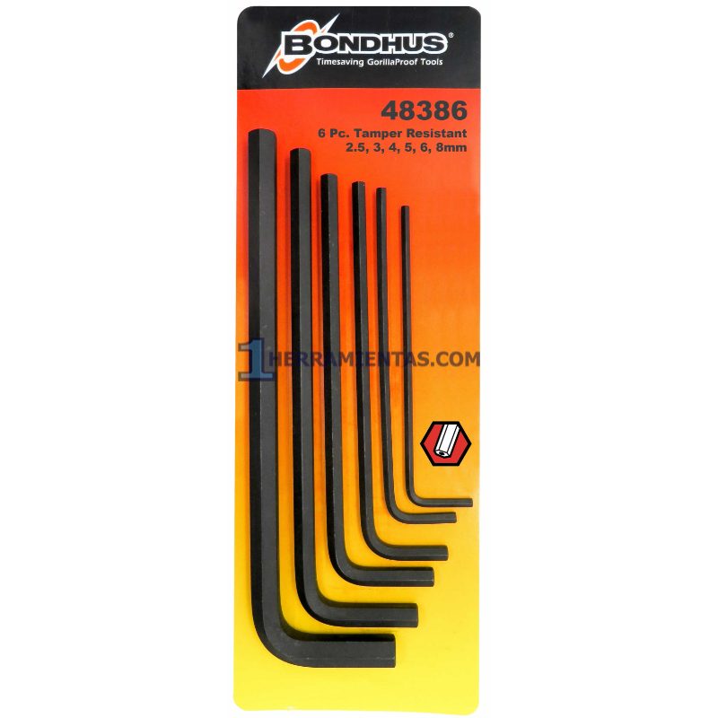 JUEGO DE 6 LLAVES HEXAGONALES DE SEGURIDAD MÉTRICO, 2.5MM A 8MM. BONDHUS 48386