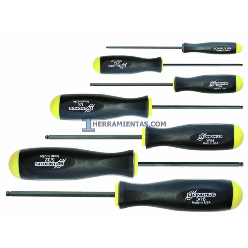 JUEGO DE 7 DESARMADORES HEXAGONALES PUNTA DE BOLA FRACCIONALES. 5/64″ A 3/16″. BONDHUS 10645