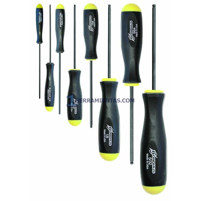 JUEGO DE 8 DESARMADORES HEXAGONALES PUNTA DE BOLA FRACCIONALES. .050″ A 5/32″. BONDHUS 10632