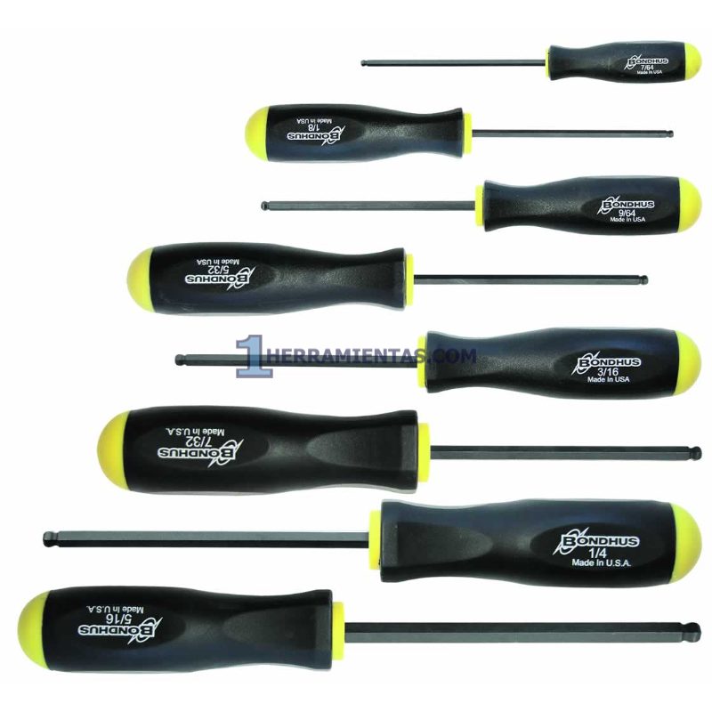 JUEGO DE 8 DESARMADORES HEXAGONALES PUNTA DE BOLA FRACCIONALES. 7/64″ A 5/16″. BONDHUS 10633